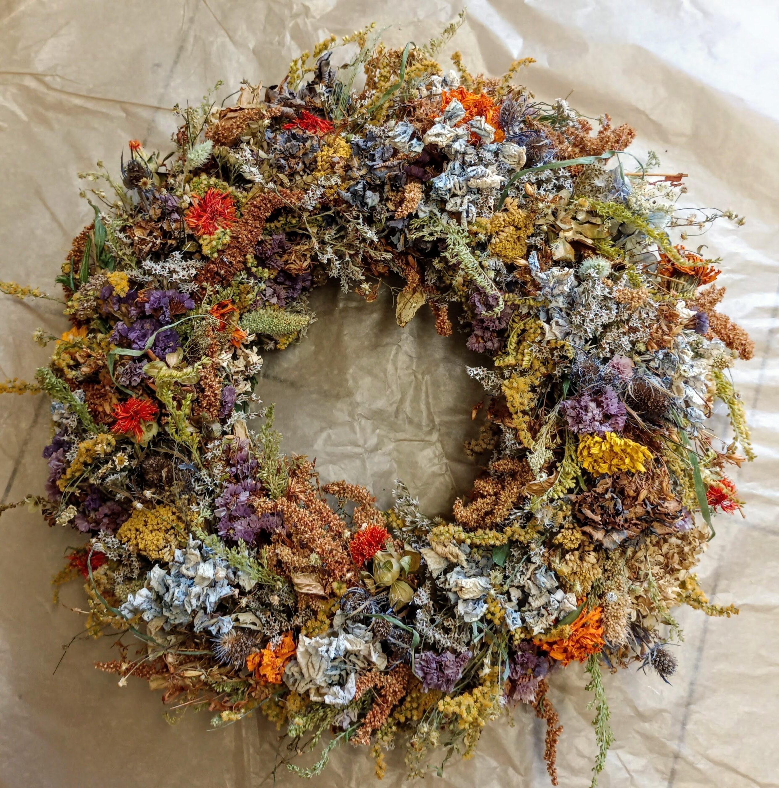 Letní věnec ze sušených hortenzií, statice, světlice, solidága, třezalky, laskavce a travin.